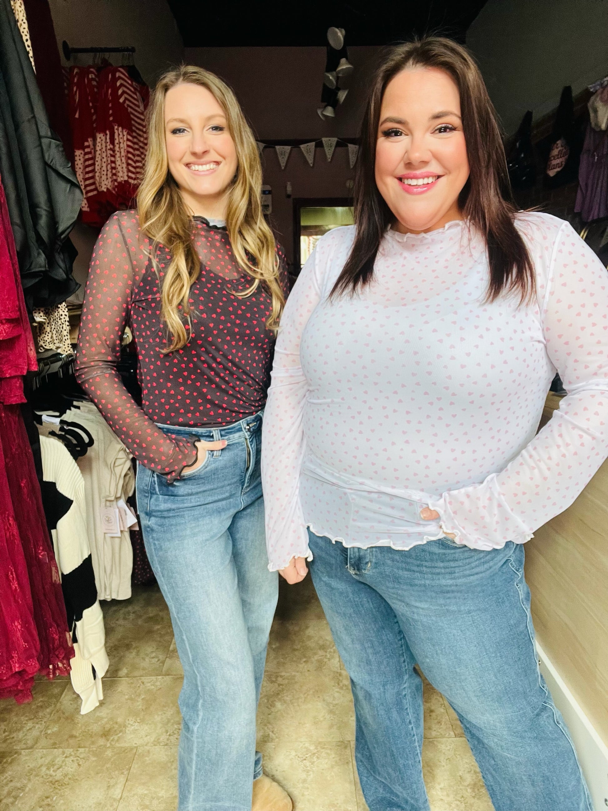Fall in love with this romantic soft mesh top featuring an adorable scattered heart print. Perfect for Valentine's Day and beyond, this feminine piece combines comfort with charm.